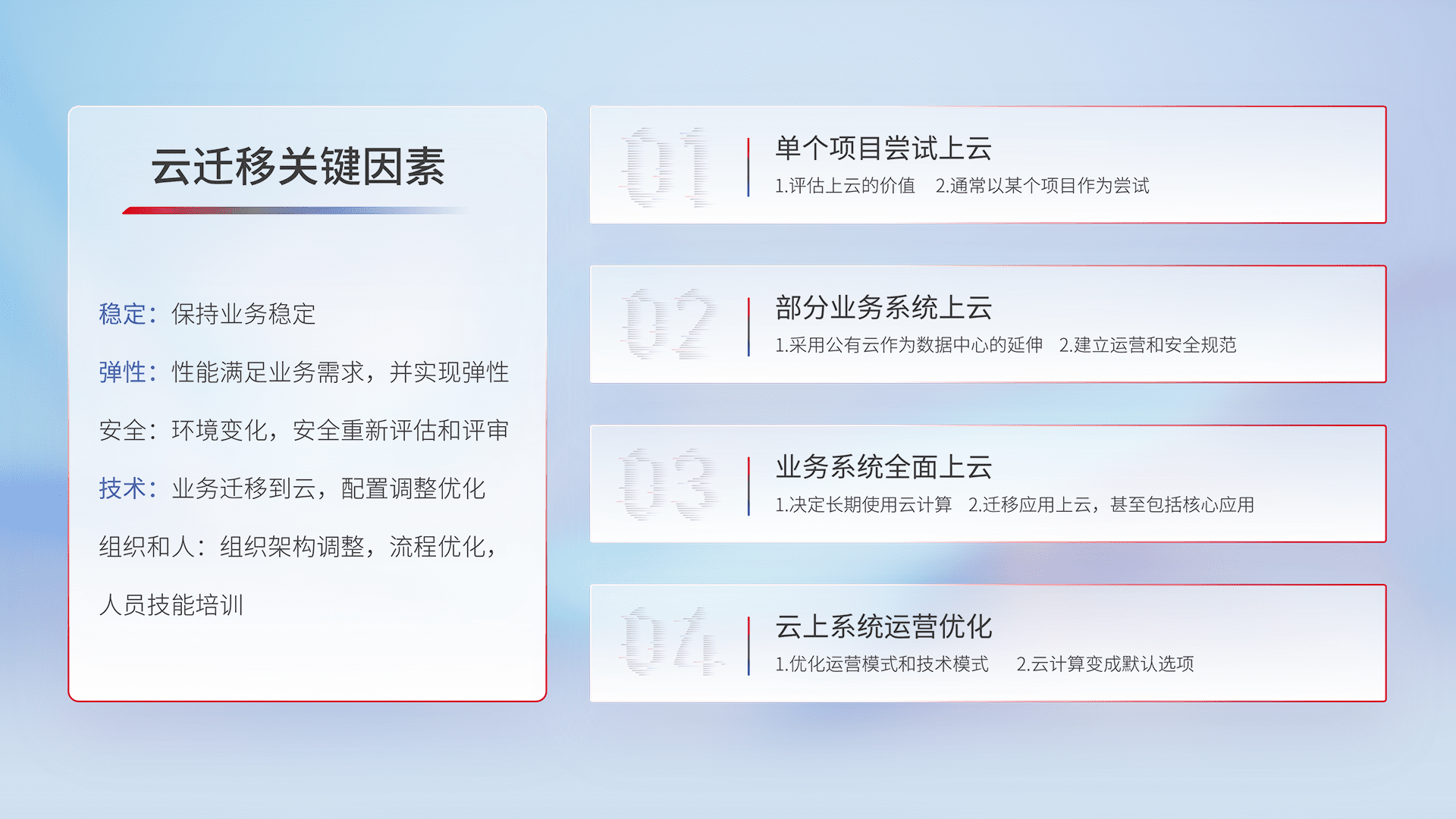 结合实际业务,,从规划设计、、云平台选型、、、、云原生改造、、、数据迁移、、集成交付,,,,迁移全过程为客户识别最佳上云路径,,,做好风险识别管理,,,设计网络架构、、身份权限、、、、安全审计合规、、、操作审计、、、、日志审计、、、监控告警策略、、、多站点容灾设计等,,,,对云上基础设施进行整体规划,,提升IT治理水平,,以满足弹性、、、、高可用、、、、高性能的需求。。
