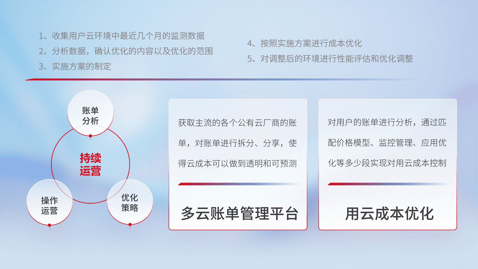 通过多云纳管,,,以统一的资源数据模型把客户的云资源进行抽象和封装,,,进而实现对多云资源的统一操作,,保障云资源管理的可靠性、、、、稳定性与可用性。。。。量身定制化运维内容,,,配置、、、、开发运维、、、补丁管理、、、备份、、监控、、、认证和访问管理、、、审计和日常巡检等,,,,保障在用云过程中的可靠度,,稳定度以及高可用率。。